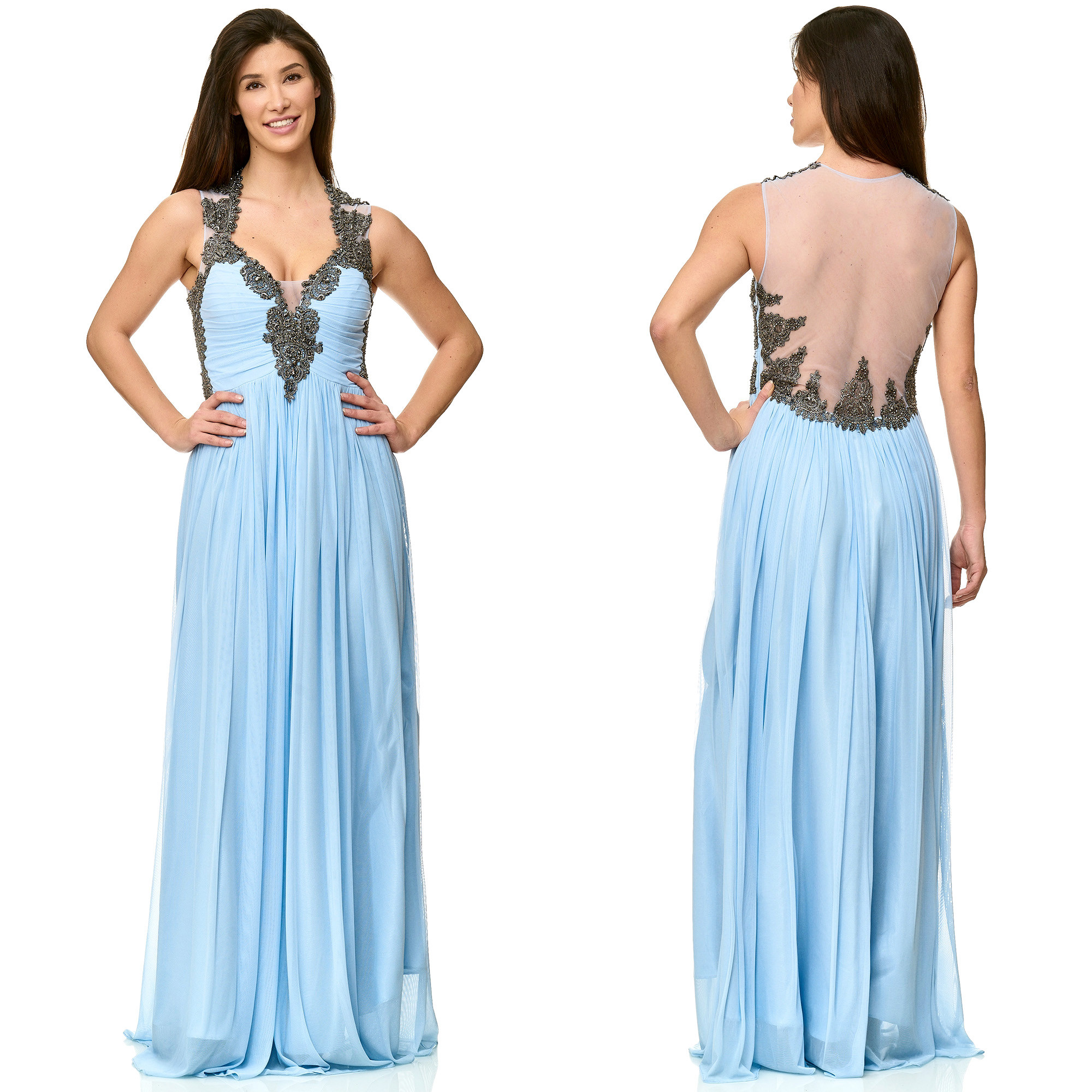 De avondjurk is gemaakt van een zachte chiffon en heeft zijwaarts een rits.