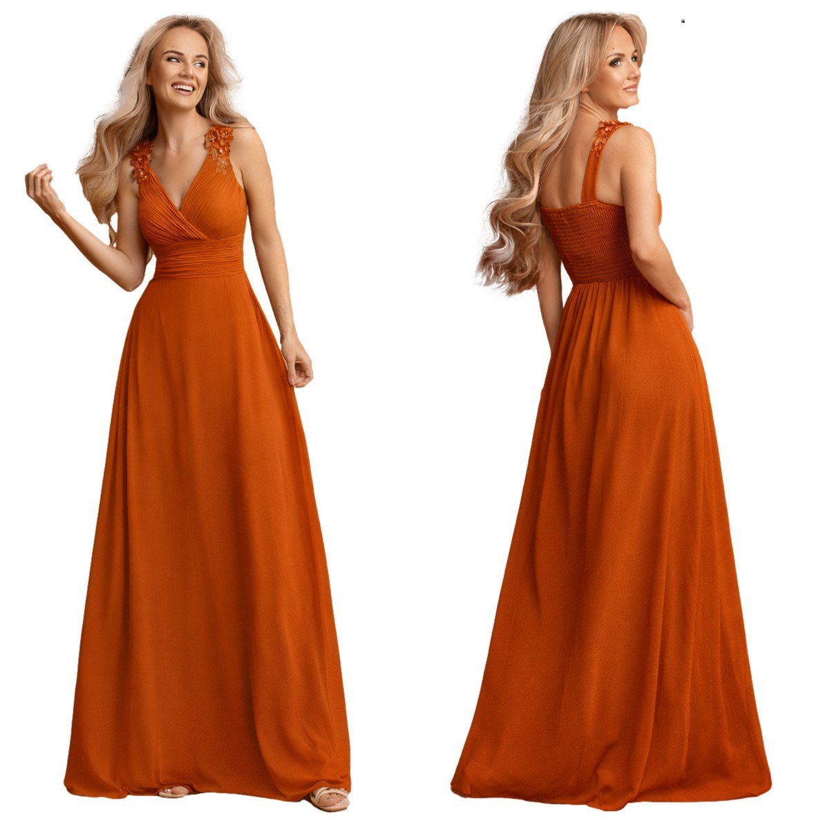 Een galajurk van chiffon met op de schouderbandjes een bloemen-borduursel.