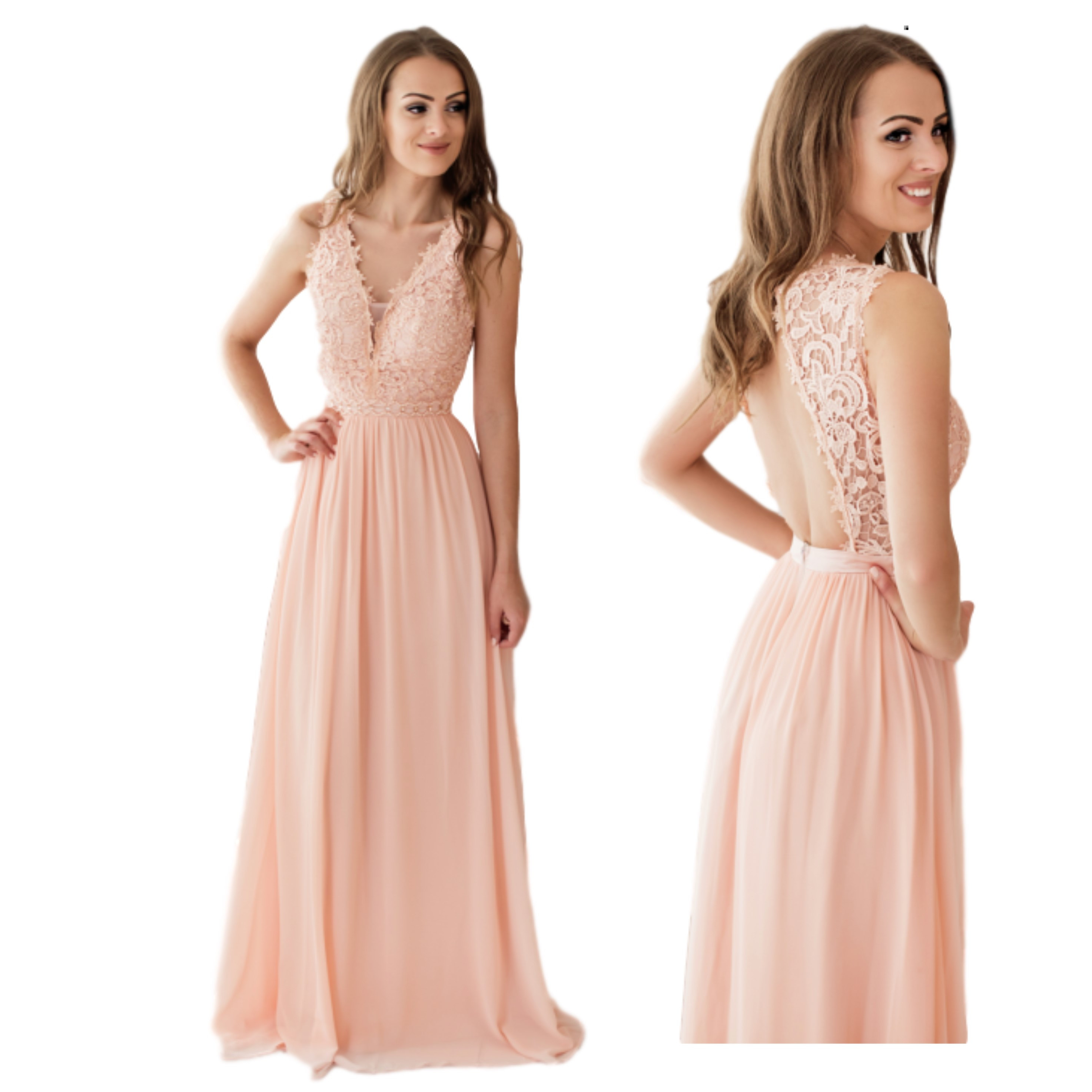 Galajurk van chiffon . De top is van kant met pareltjes. De jurk heeft een lage rug.