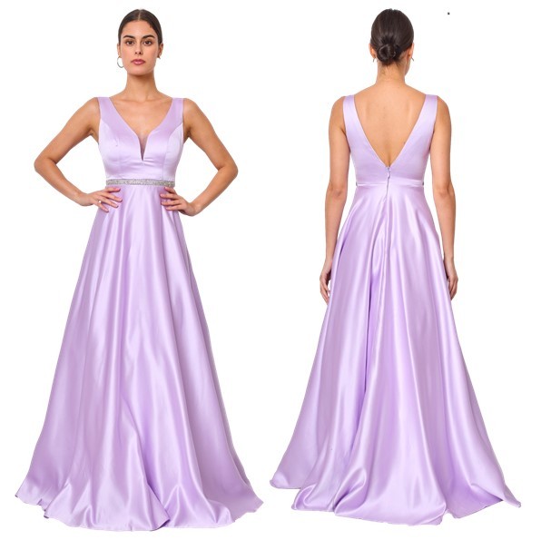 Een galajurk van satijn afgezet met een zilver bandje op de heup.