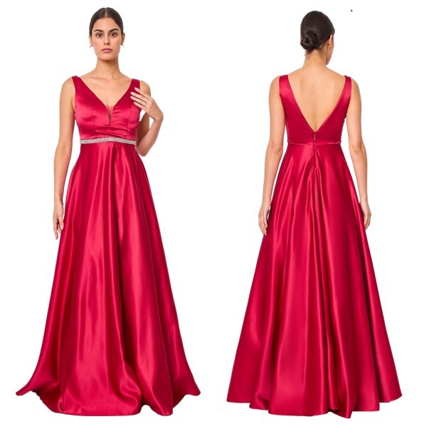 Een galajurk van satijn afgezet met een zilver bandje op de heup.