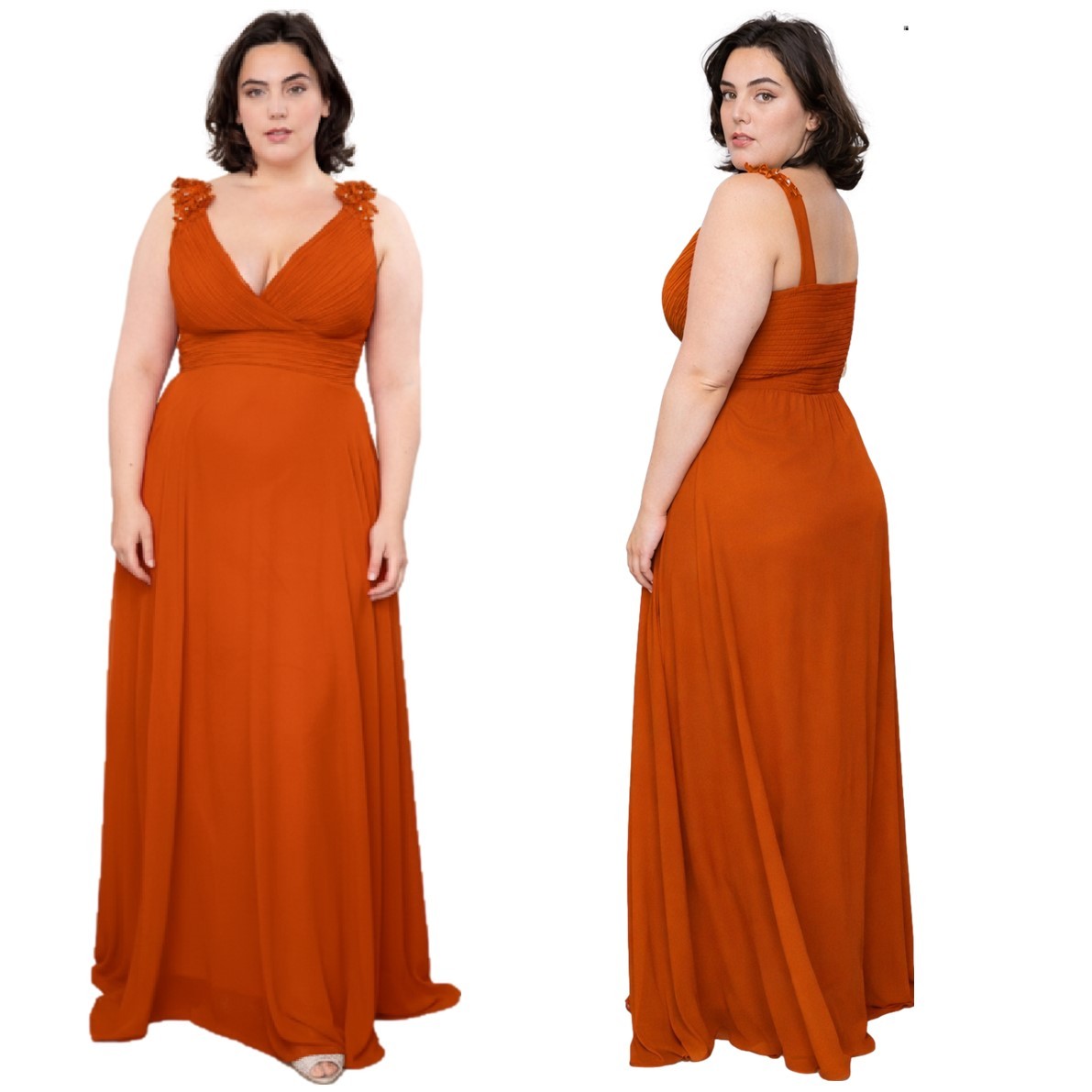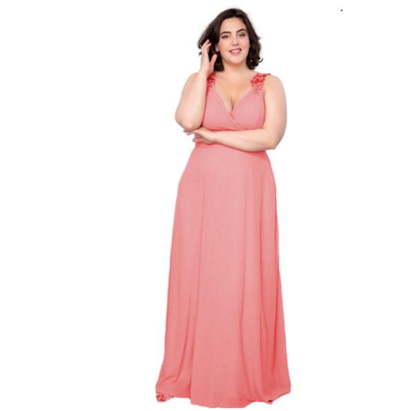 Een galajurk van chiffon met op de schouderbandjes een bloemen-borduursel.