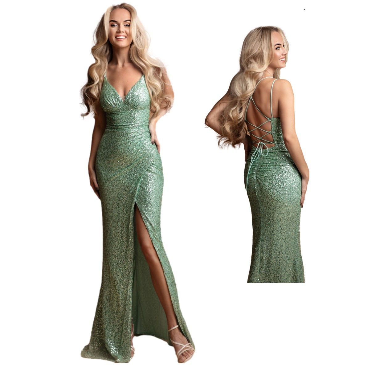 Galajurk sage green schouderbanden-split paillettenHM2508
