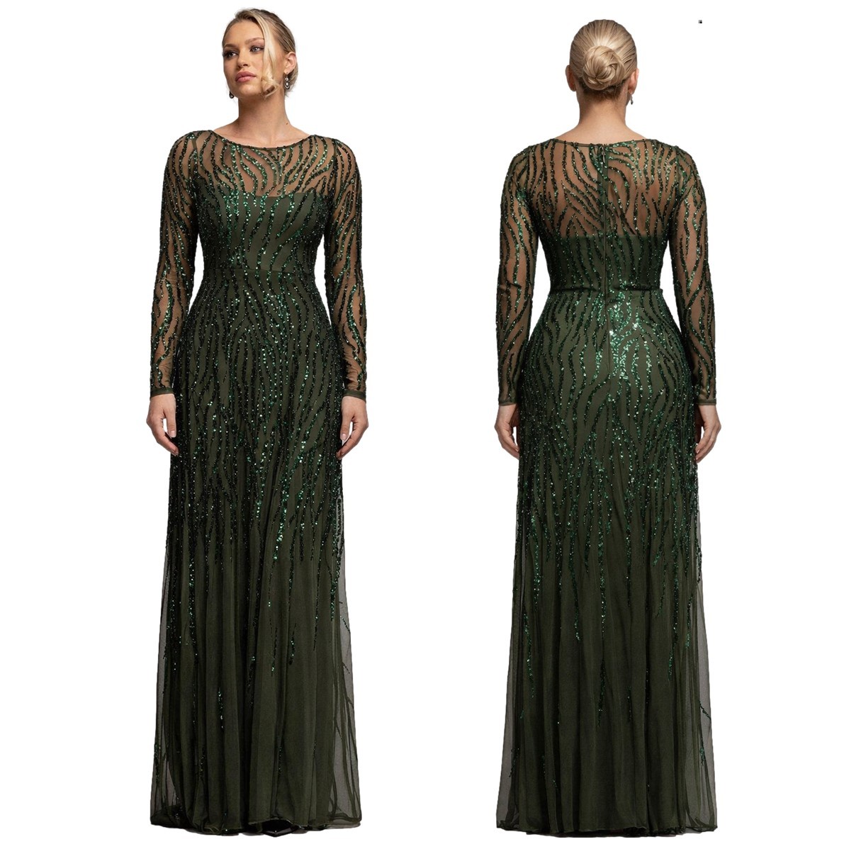 Galajurk olijfgroen lange mouwen-ronde hals strass-steentjesDR4782