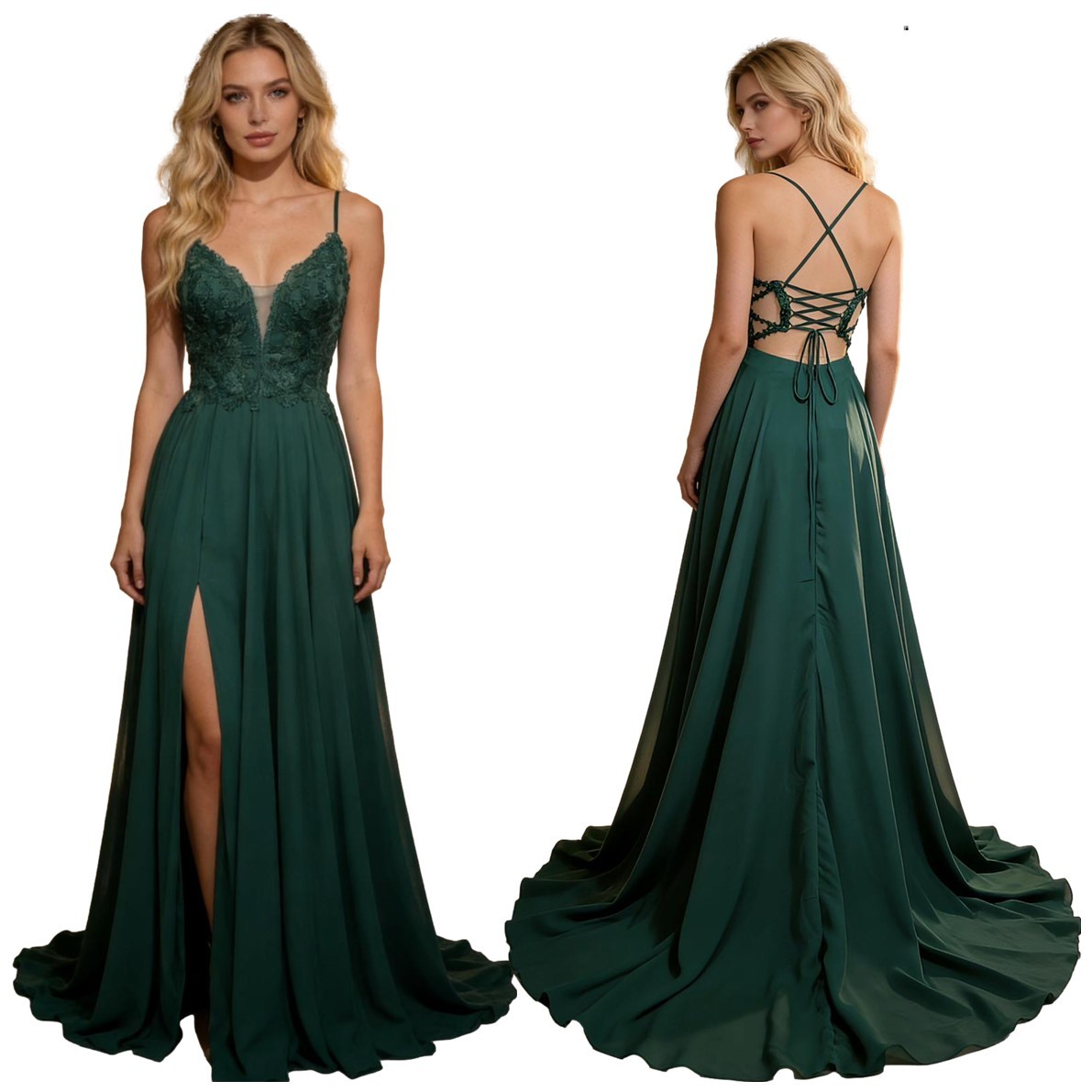 Galajurk donkergroen schouderbanden-split chiffon-kantF8023