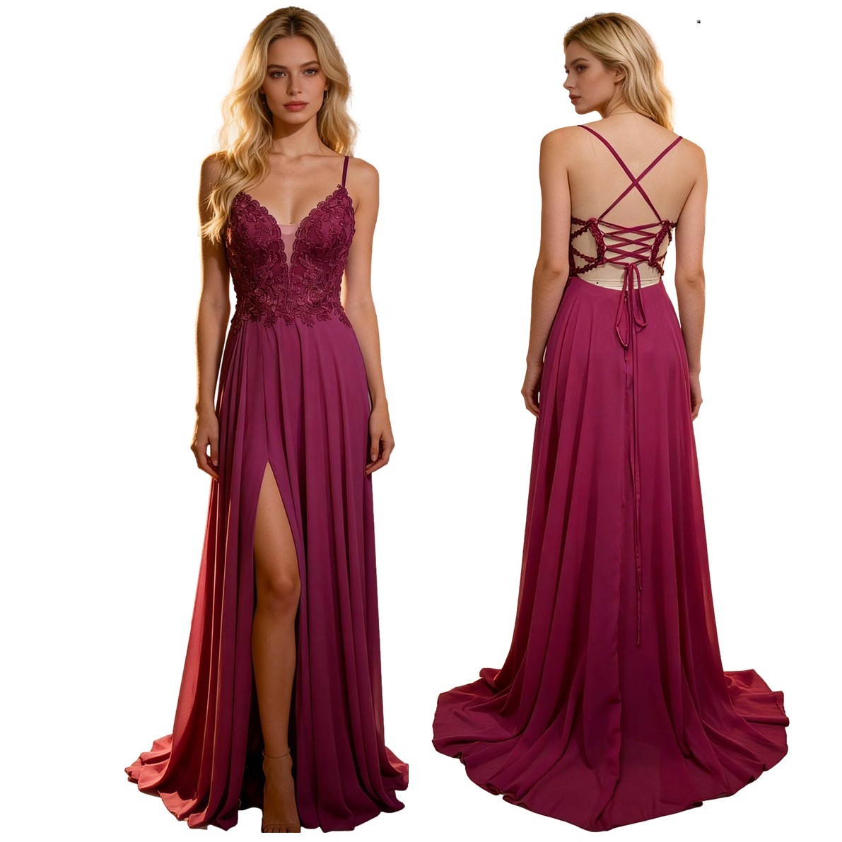Galajurk fuchsia schouderbanden-split chiffon-kantF8023