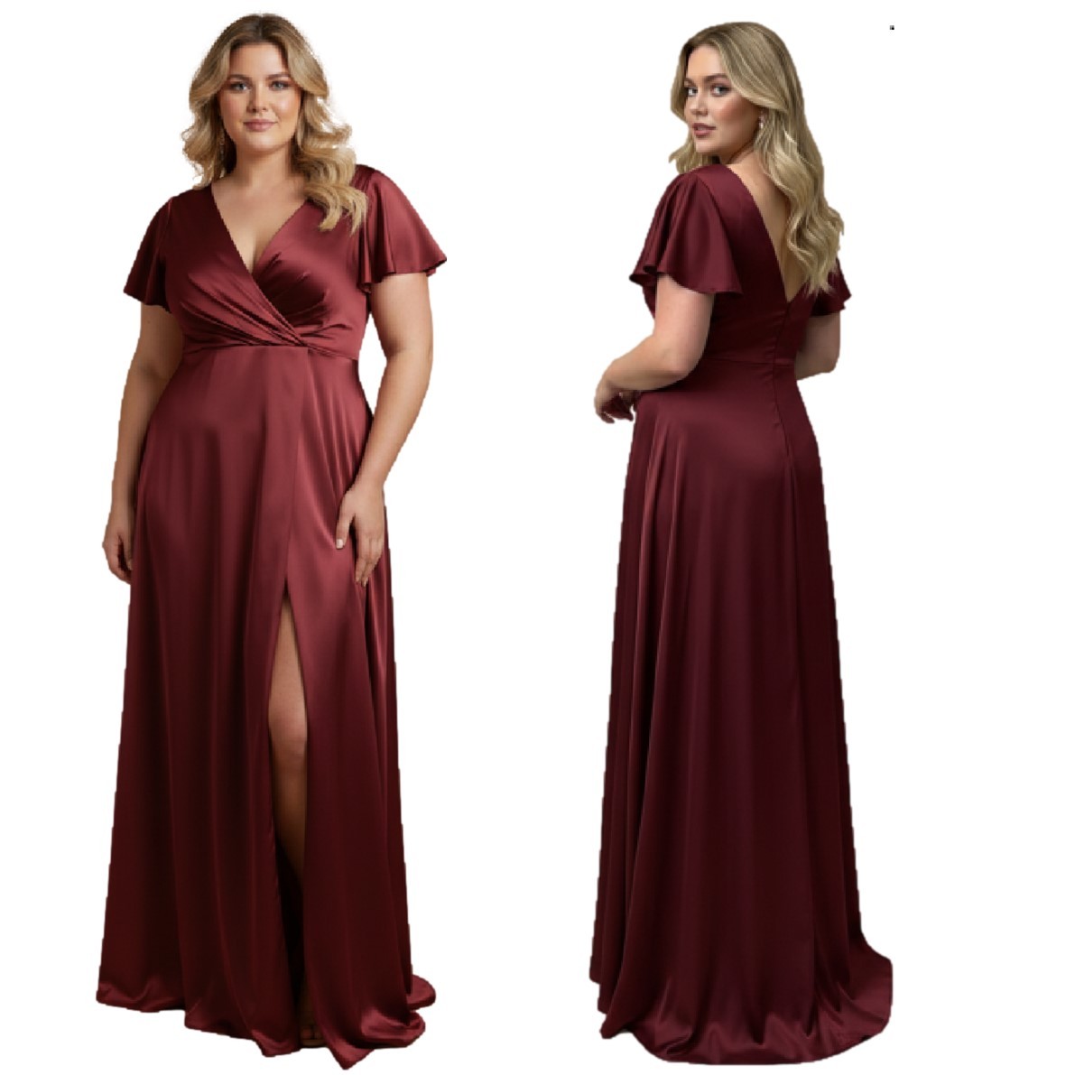 Galajurk bordeaux-rood korte mouwen-ronde hals-split glans-satijnR1640QS