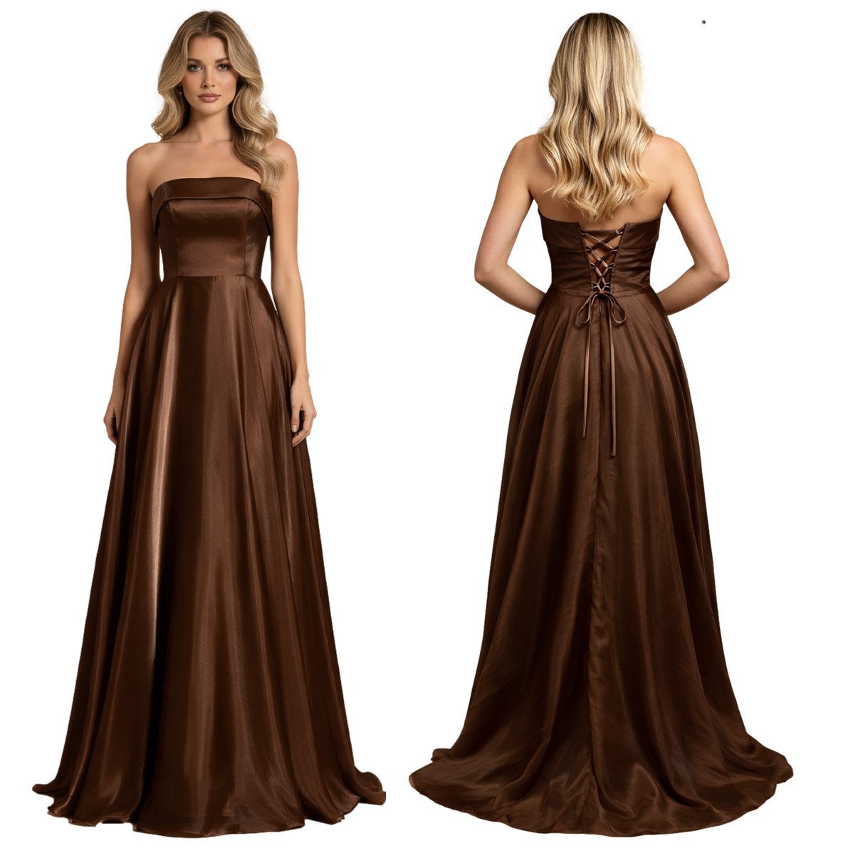 Galajurk bruin strapless (optie schouderbanden) glans-satijn-tuleHM2518